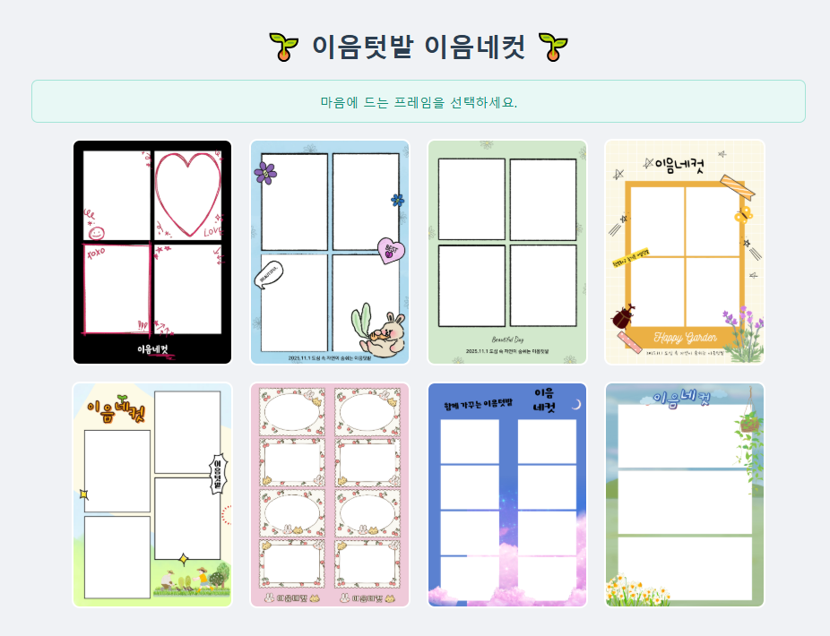 도심 속 생태텃밭 이음텃밭의 한 해 농사를 마무리하며 11월 1일에 이음리 한마당 축제를 계획중에 있습니다. 여러 가지 활동이 예상이 되는데 그 중에 이음네컷을 해 보려고 만들었습니다.