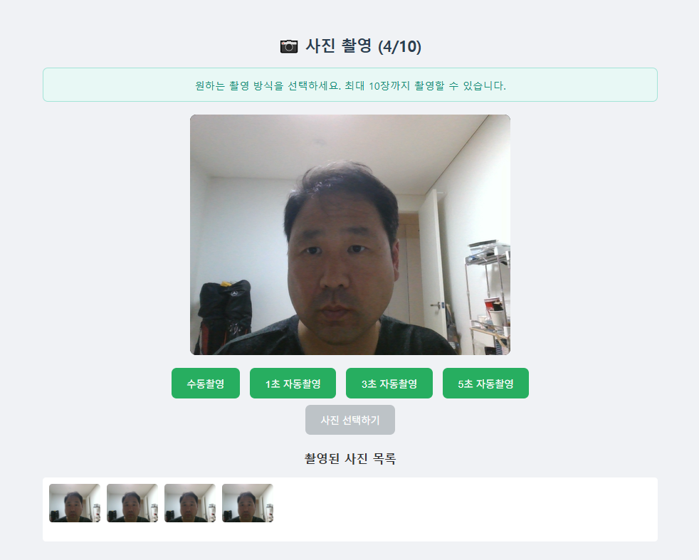 기존에는 10장의 사진을 촬영 후 슬롯의 수만큼 선택했는데 사진 선택하는 과정이 번거로울 수 있어 슬롯의 수만큼만 사진이 촬영되도록 코드를 수정했습니다. 따라서 사진을 선택할 필요가 없어져 시간이 단축됩니다.