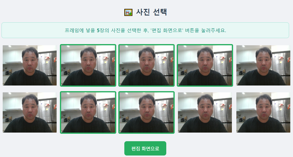선택한 프레임의 슬롯 수 만큼만 사진이 촬영되도록 하였습니다. 따라서 사진을 선택할 필요가 없습니다. .