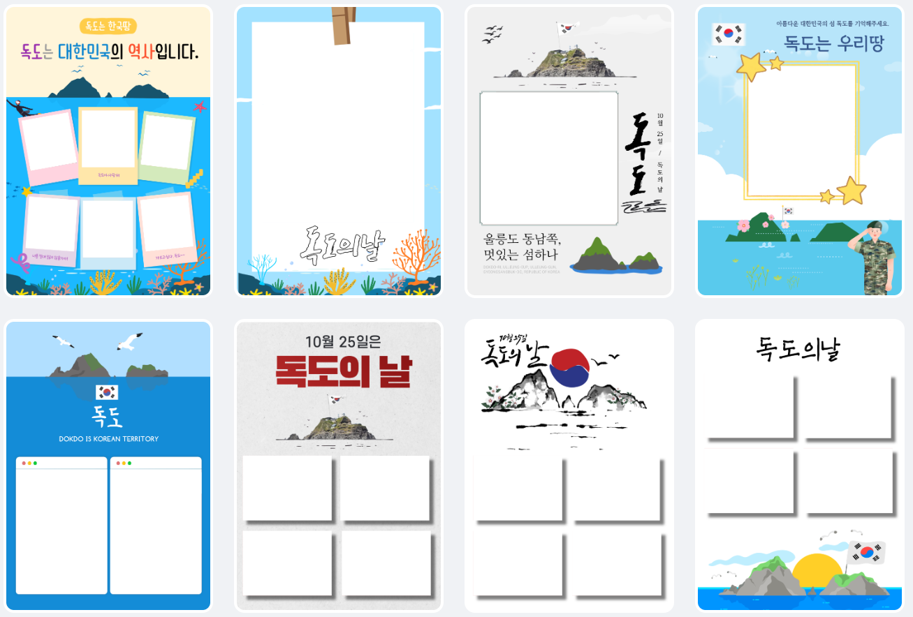 이 전에 비해서 컷 수가 좀 적습니다. 한 컷도 3개이고 2컷 짜리도 있는데요. 제 생각에 이 앱을 주로 사용하시는 분이 선생님들이 되지 않을까 해서입니다. 보통 독도의 날을 맞이하면 독도사랑 그림을 그리거나 독도 모형 만들기 등의 활동을 하는데 학생들이 만든 작품을 학생과 같이 사진을 찍는 활동으로 마무리 할 것이 예상되기 때문입니다. 그래서 슬롯이 하나인 프레임을 여러 개 만들었습니다.