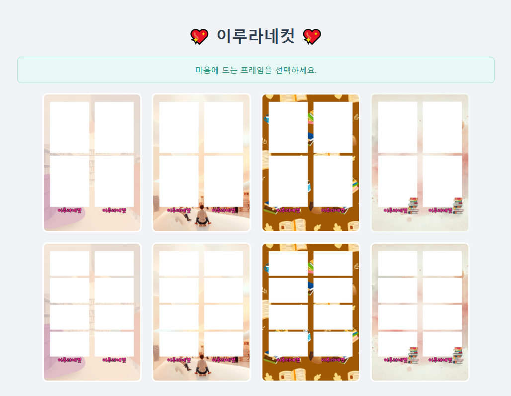 그래서 혹시 몰라 일상네컷을 만들었습니다. 코드는 기존의 코드를 재활용하였고 프레임도 동일한 것을 사용하기 때문에 '이루라네컷'과 '이루라네컷 투게더'를 연결하는 버튼을 한꺼번에 두었습니다. 기능이 거의 동일하기 때문에, 그리고 한 날 만든 것이기 때문에 따로 포스팅을 할 필요가 없기 때문입니다.
