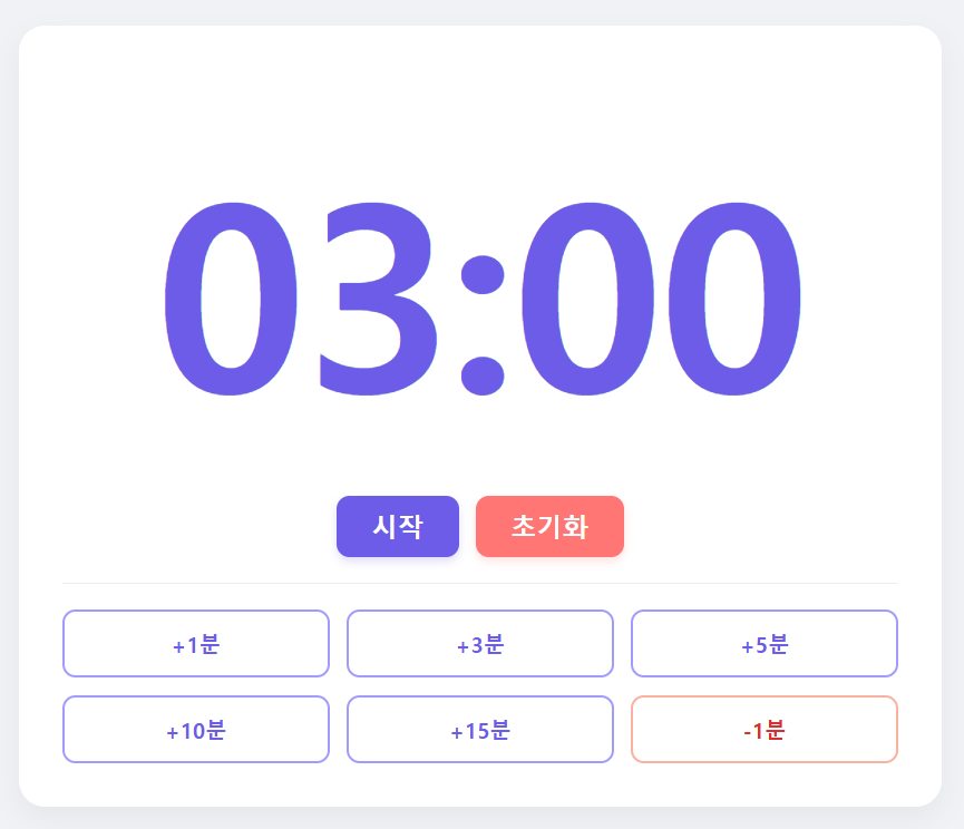 사용 방법도 간단합니다. 아래의 시간 버튼을 눌러서 시간을 설정합니다. 버튼을 누르면 해당 시간만큼 합산이 됩니다. 시간을 줄이고자 할 때는 -1분 버튼을 눌러서 조정합니다. 시작 버튼을 누르면 타이머가 1초 간격으로 남은 시간을 보여줍니다. 이때 '시작'버튼은 '일시정지' 버튼으로 바뀌고 다른 버튼은 모두 비활성화 됩니다.